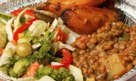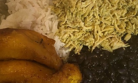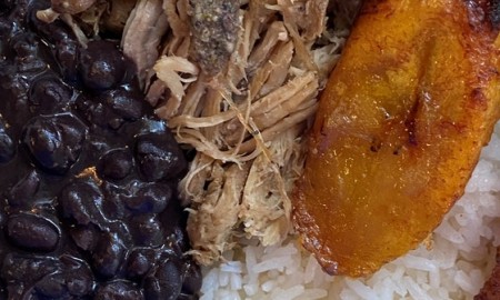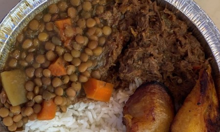 served with rice, black beans or lentils, plantains and your choice of protein.