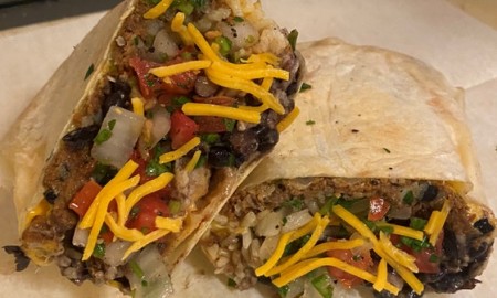 Your protein choice with salsa, cheddar cheese, sour cream, black beans and rice.