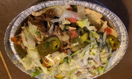Chips, melted Queso, Lentils or Black beans, Lettuce, Pico, Sour cream, and choice of protein.